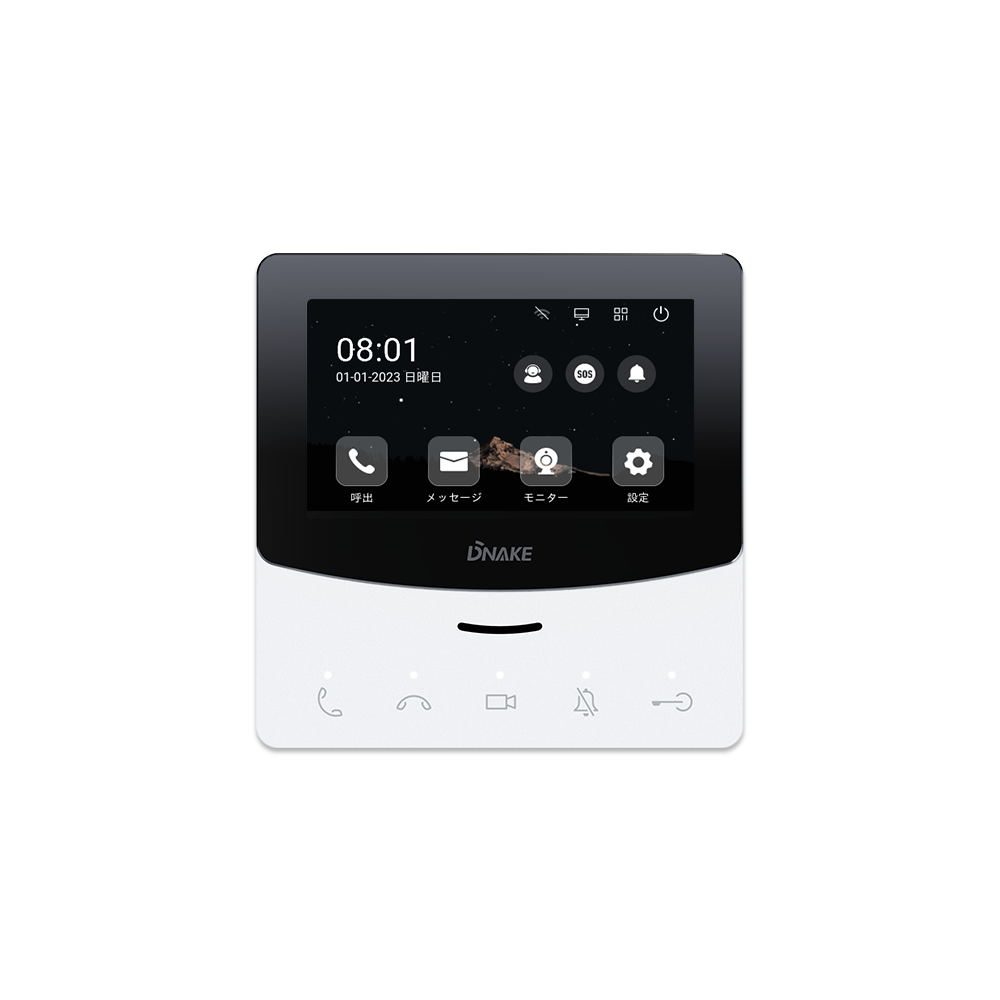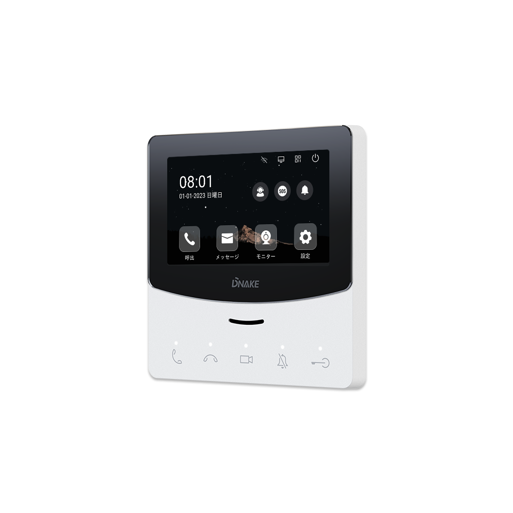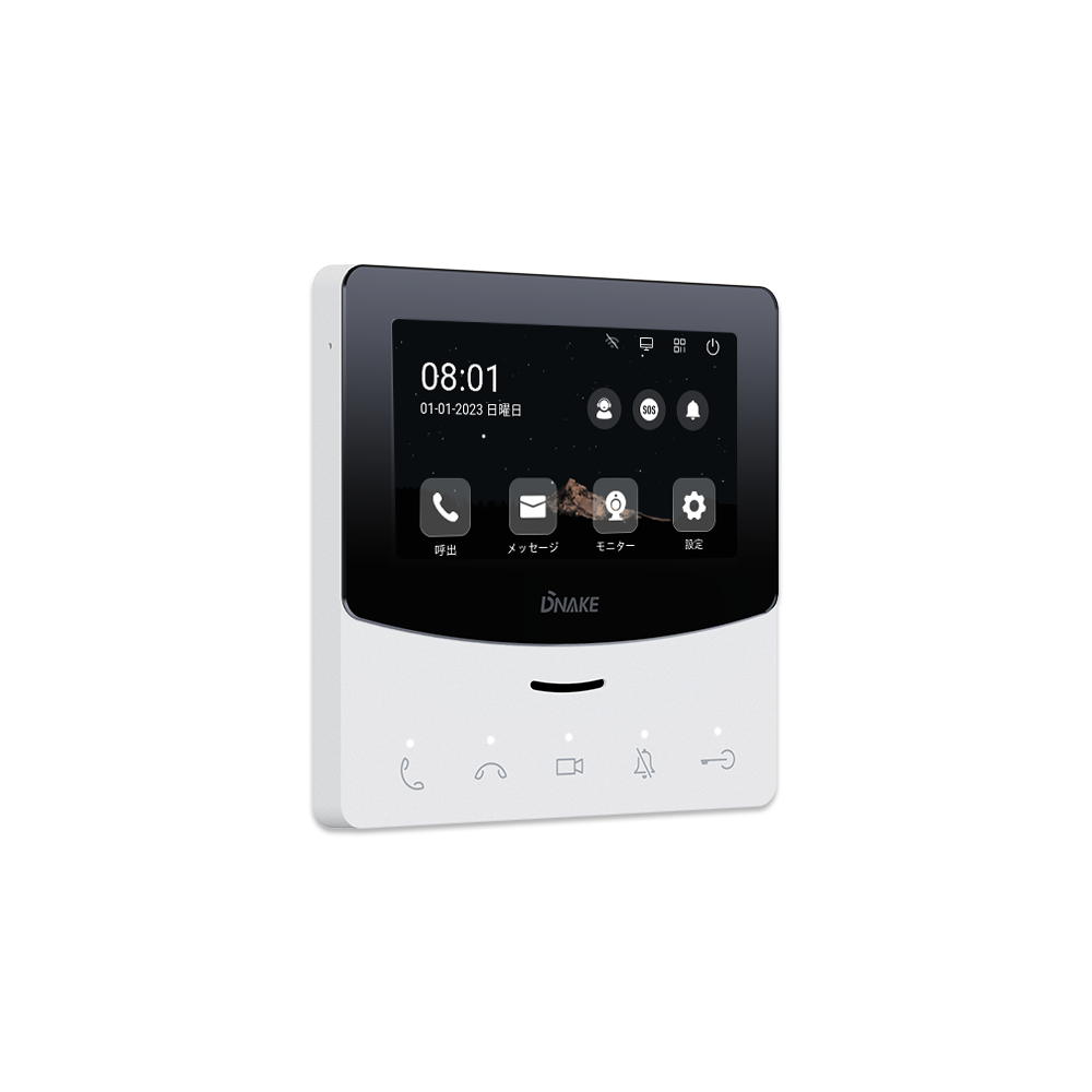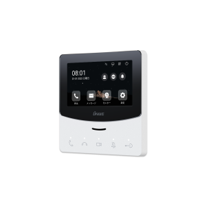 DNAKE E214は4.3インチタッチスクリーンを搭載したコンパクトでスタイリッシュなデザインのIPインターフォン用の 室内モニターです。Linux OSを搭載し、世界標準のSIP2.0 プロトコルに対応し、音声およびビデオ通話機能を提供します。限られたスペースに収まるスリムなボディに、充実した機能を搭載しています。